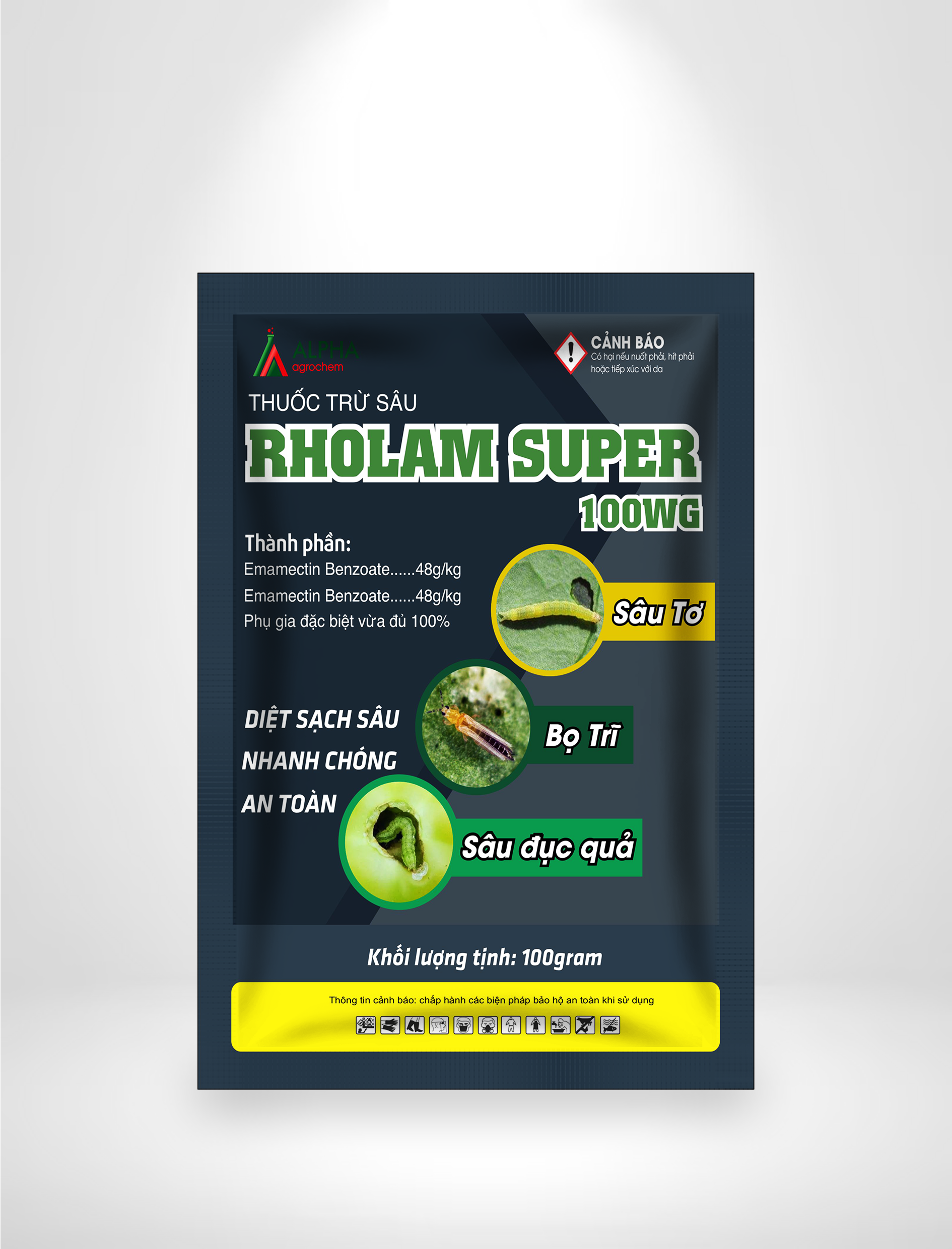 - RHOLAM SUPER 100WG là thuốc trừ sâu dang hạt. Thành phần chính bao gồm: Emamectin Benzoate (98g/kg) và Matrine (2g/kg).